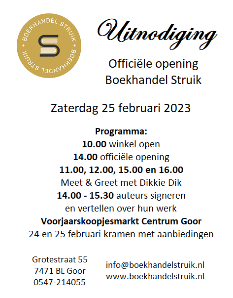 Hoewel de winkel aan de Grotestraat 55 al zo’n 10 weken geopend is, wordt Boekhandel Struik op zaterdag 25 februari pas echt officiëel geopend. Om 14.00 uur wordt de opening verricht door de familie Struik en Moorman.