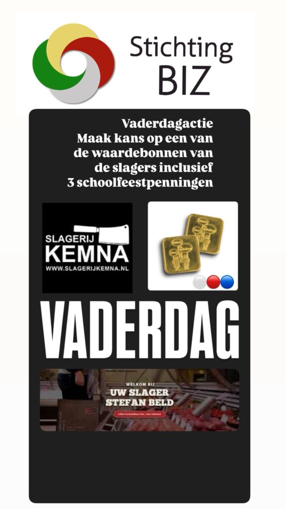 Bij elke BIZ-winkelier maakt u kans op een fijne cadeaubon van een van beide slagers. Daarnaast doet de BIZ er drie gloednieuwe jubileumpenningen bij voor het komende School- en Volksfeest.