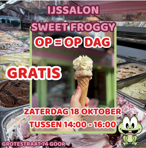 IJssalon Sweet Froggy viert op zaterdag 18 oktober de laatste dag van het ijsseizoen met een feestelijke Op=Op Uitdeeldag.
