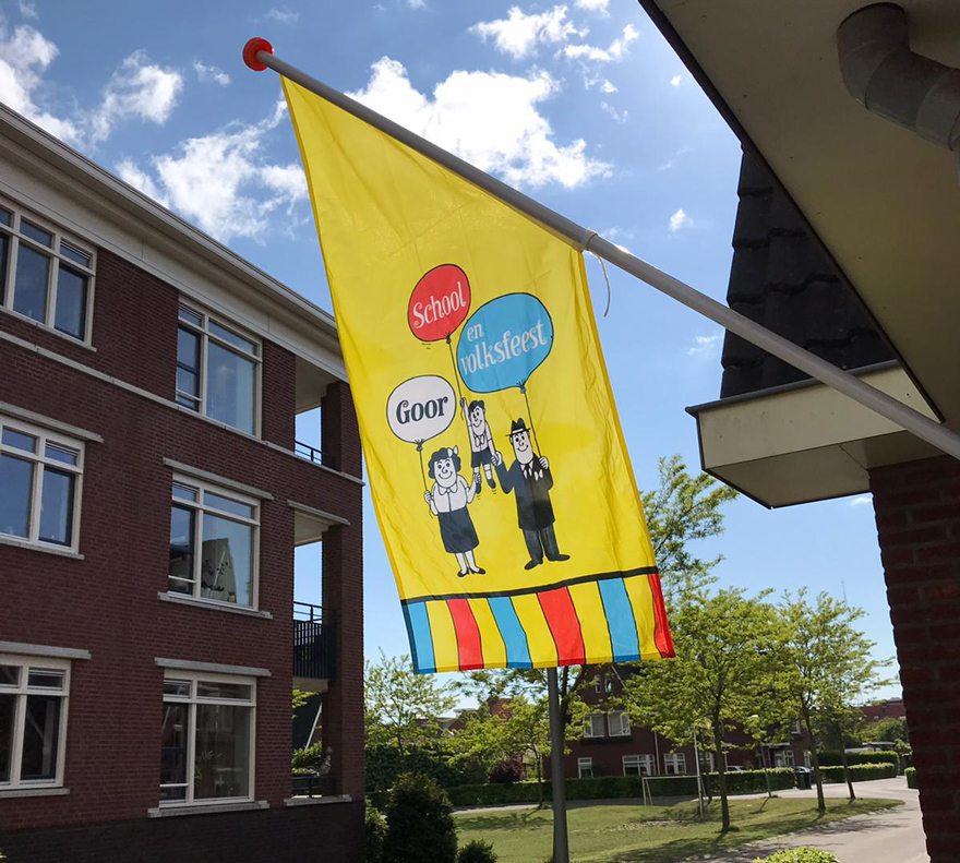 Schoolfeestvlaggen zijn te koop bij Servicestation Hoek, Primera De Bandijk, Provak en Wiemerink de echte Groenteman.